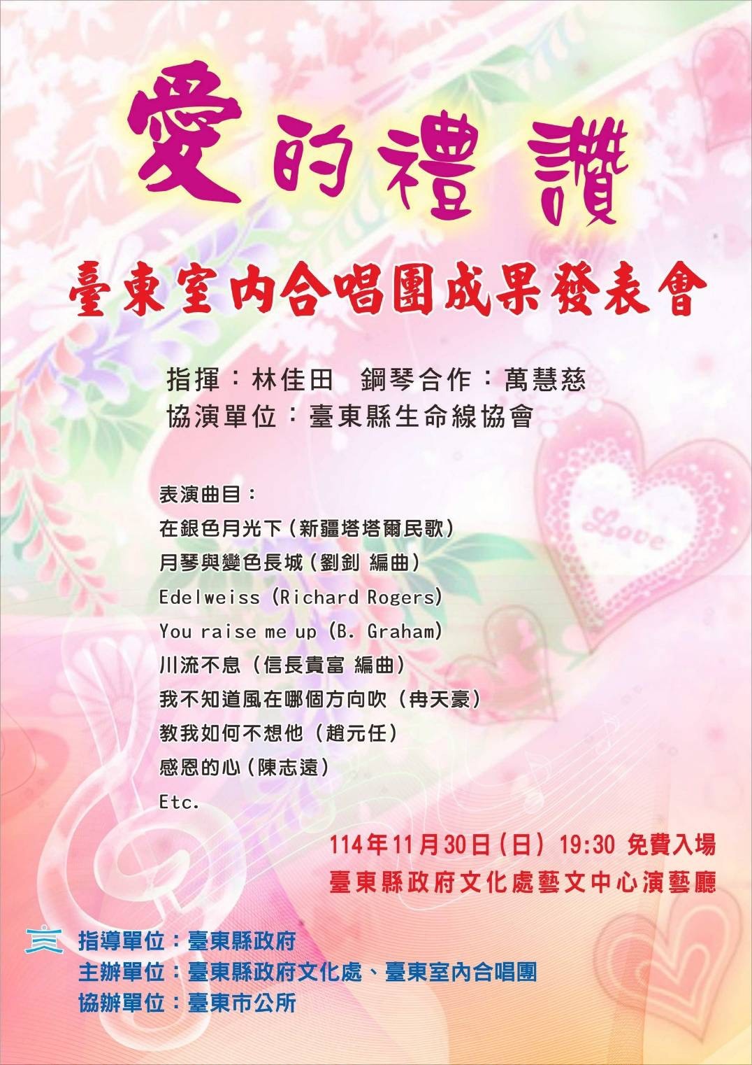 【音樂會公告】本系聲樂老師 林佳田老師 擔任臺東室內合唱團成果發表會指揮與合唱指導